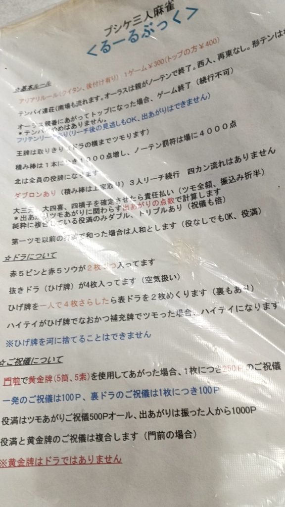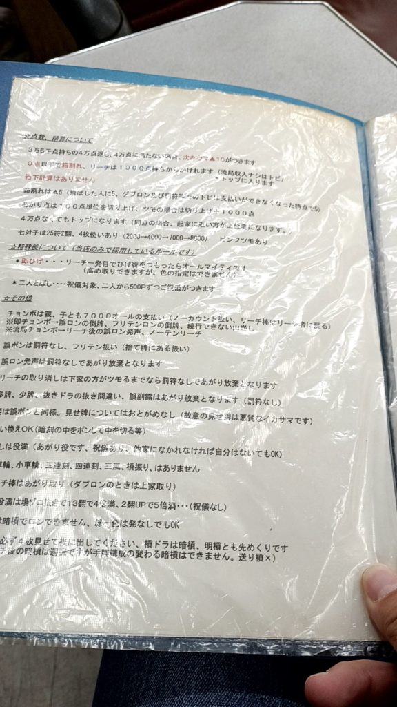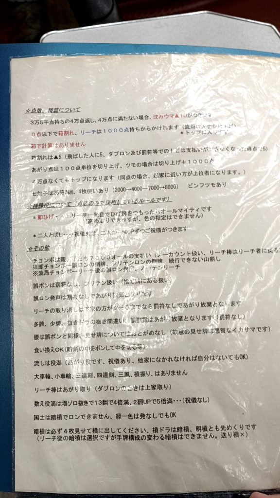 一言でいうと、アリアリツモ損あり1000点加符のお店という感じ。何気に珍しいのでは??と思います。これで完先のお店はちょいちょい見ますけど、アリアリは関西では珍しい気がします。