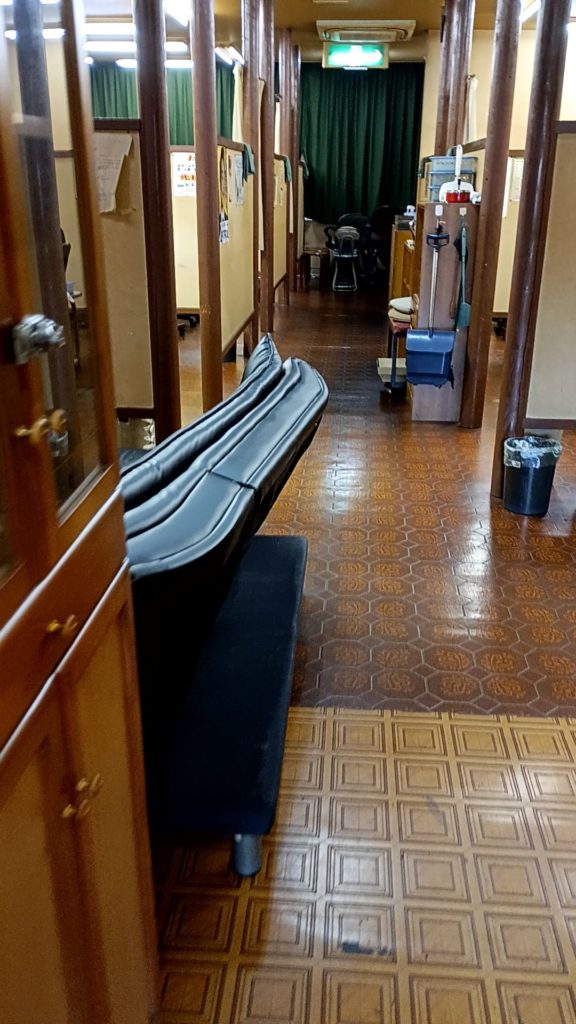 とりあえず廊下を歩いて一番奥まで行くと、テレビ+ソファー+マスターのおじいちゃんというスペースがあり、マスターはスヤスヤと睡眠中でした。