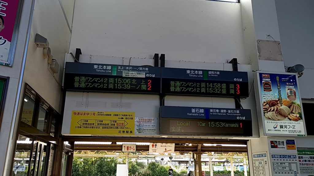 盛岡から花巻までは東北本線なですが、2両編成のワンマンでした。電車の本数は1時間に1本という感じです。