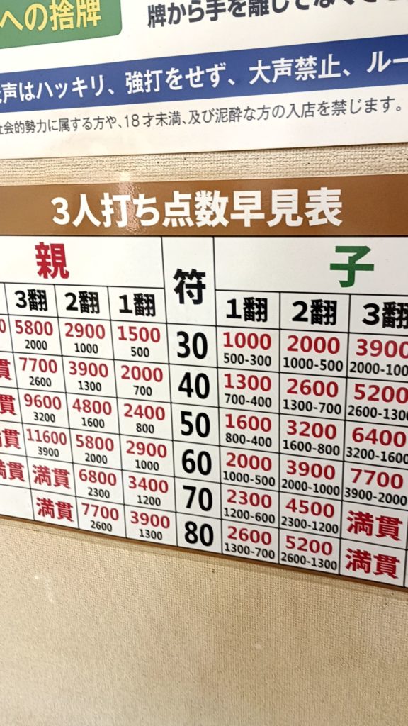 立っている卓は4人回しが2卓の状況でした。多分このお店は3人回しはやらず4人回し限定のお店な気がしますね。