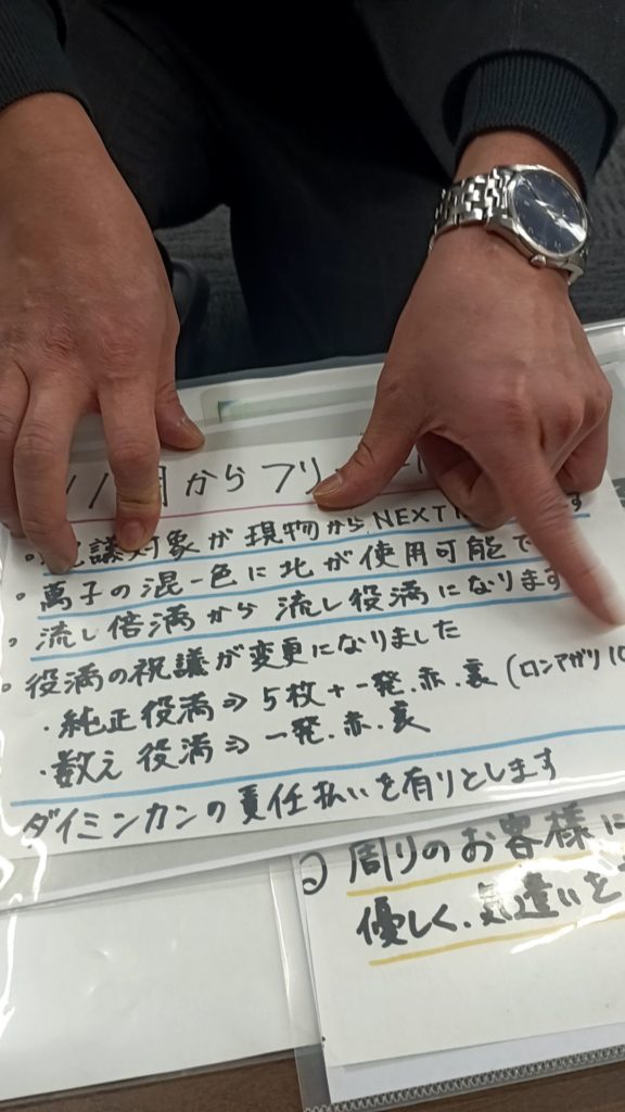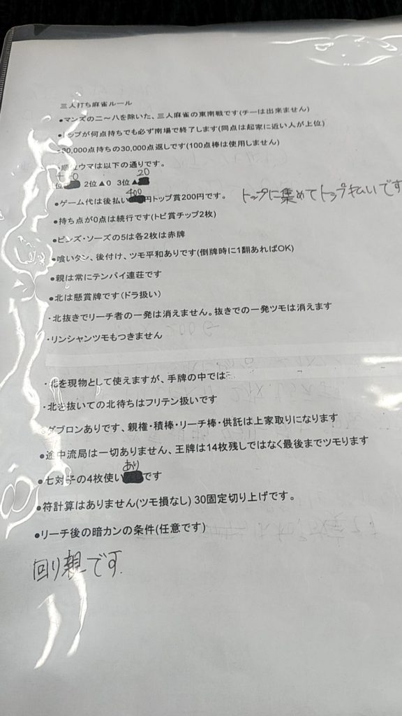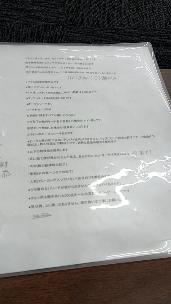 ルール説明はマスターがかなり一生懸命にやってくれました。凄い気合の入ったマスターで、その一生懸命さが伝わってきましたね。イベントもかなり熱いのをやっていました。細かくは覚えていませんが、当日の2戦目、8戦目にトップをとるとお店から祝儀が出たり、3連勝、4連勝とかラス無し回数に応じてとかとにかく沢山やってました。