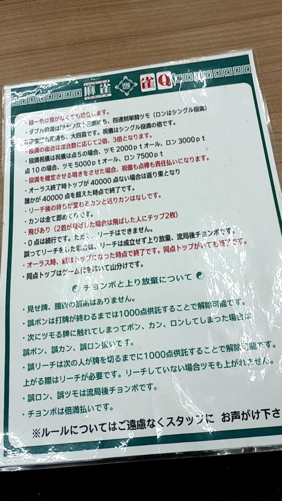 ルールはまさかのコテコテの関西サンマで驚きました。三重県で打ったサンマは全て普通の1ハン縛りのアリアリサンマだったので。他のお店でも話をしましたが、このあたりで関西サンマを打てるのはこのお店くらいなんじゃないかと。
