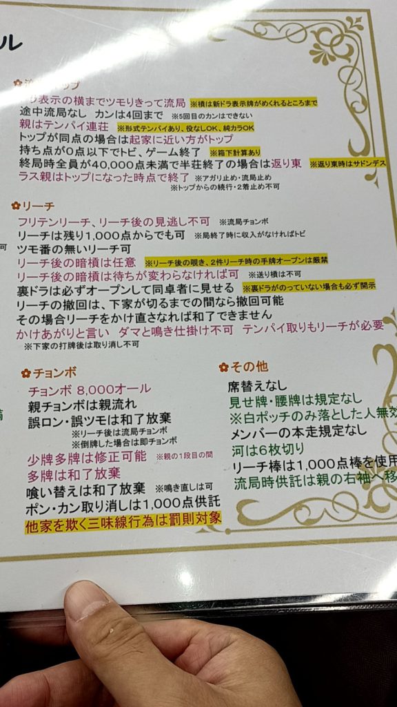 符計算あり、完先、リーチ後の暗槓強制、見せ牌腰牌のチェック・・・