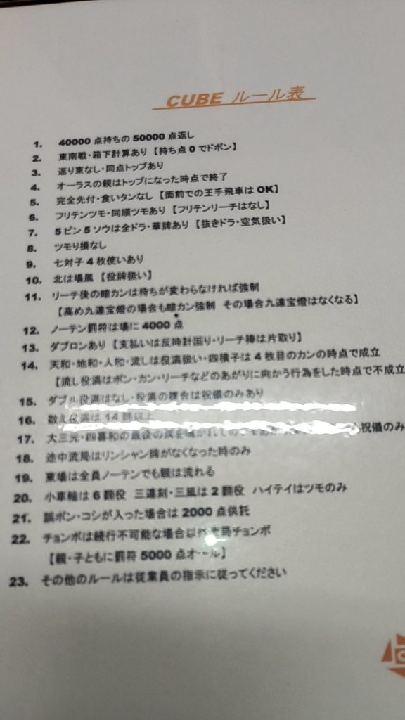 ルールはオーソドックスな関西サンマで、持ち点が40000点持ち50000点返しというところと、返り東が無いというのがが少し変わっているところくらいでしょうか。