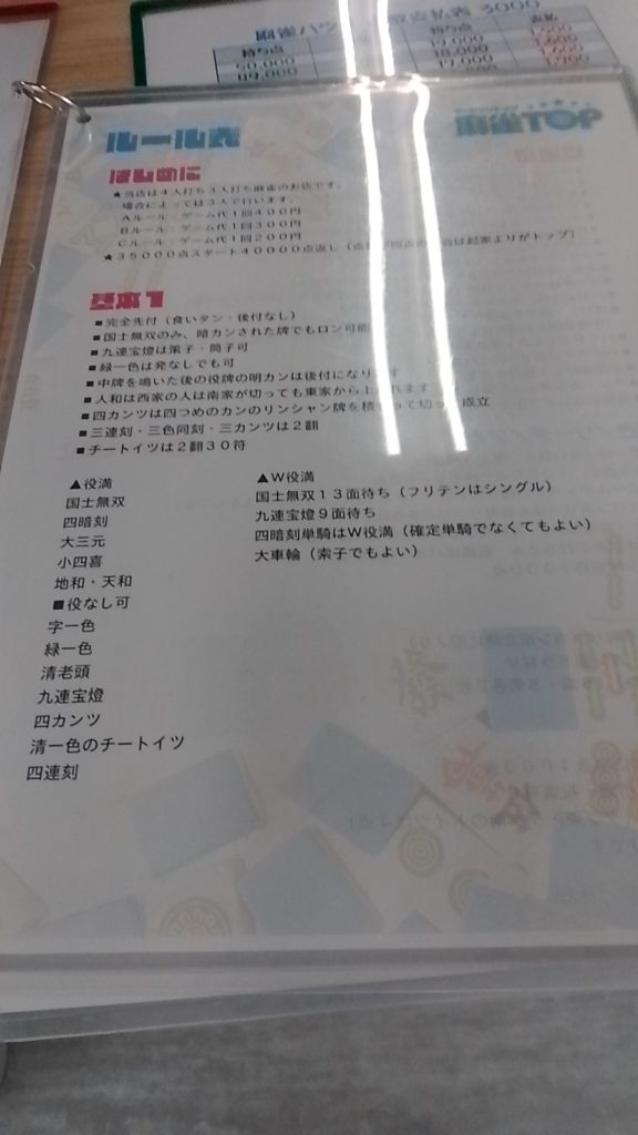 ちなみにてっきり倉敷市に来てもいくつか1500、2500とかの点数計算で500点棒まで使うお店があるかなーなんて思っていたんですが、今回行った倉敷市の4店舗では1店舗もなかったです。